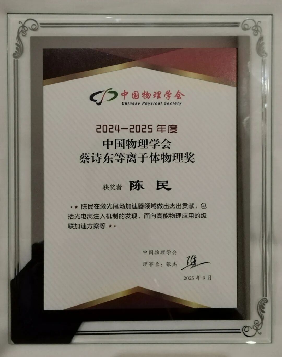 2025年9月12日,中国物理学会2025年秋季学术会议在哈尔滨工程大学举办,蔡诗东等离子体物理奖委员会公布了“蔡诗东等离子体物理奖”获奖人名单,上海交通大学物理与天文学院陈民教授获此殊荣,以表彰他在激光尾场加速器领域,包括光电离注入机制的发现、面向高能物理应用的级联加速方案等方面做出的杰出贡献。